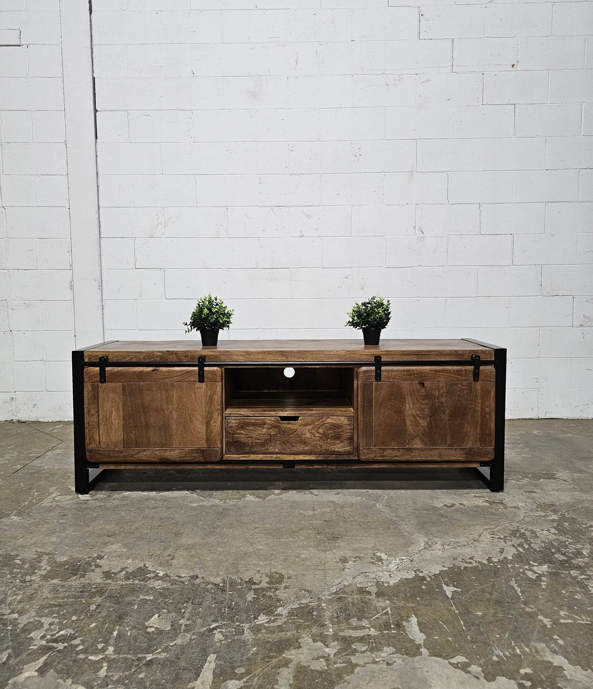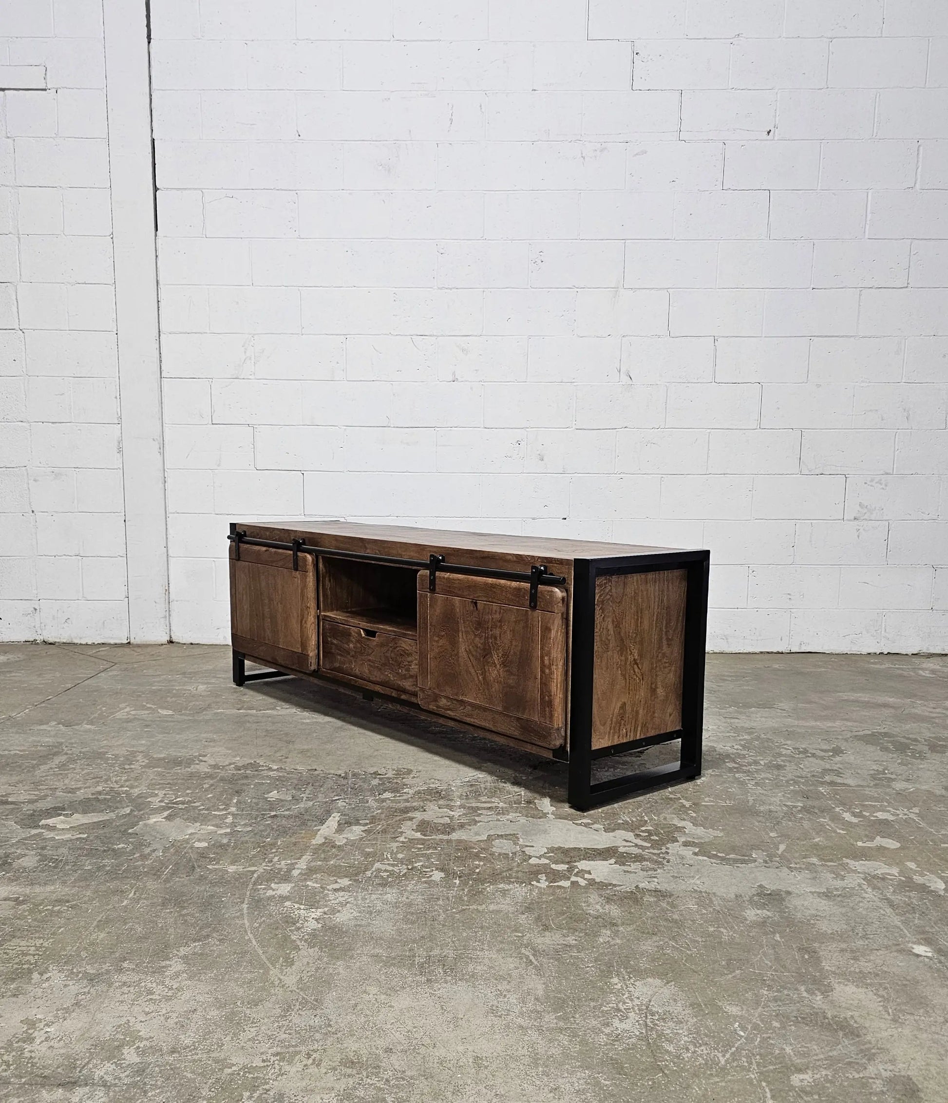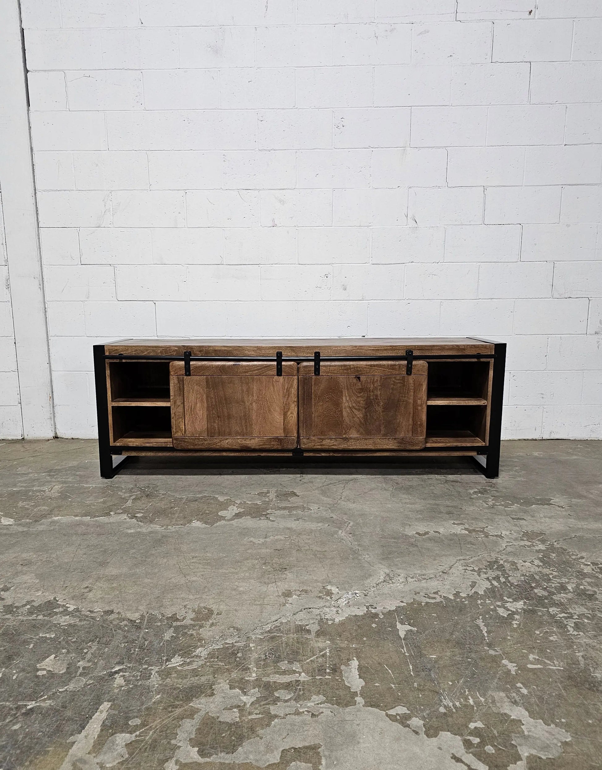 Système de Portes Coulissantes : Les portes en bois de manguier glissent sur des rails en acier noir, vous offrant la flexibilité de cacher vos appareils électroniques ou d'exposer vos objets de décoration selon vos envies.