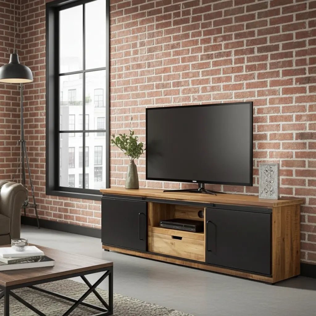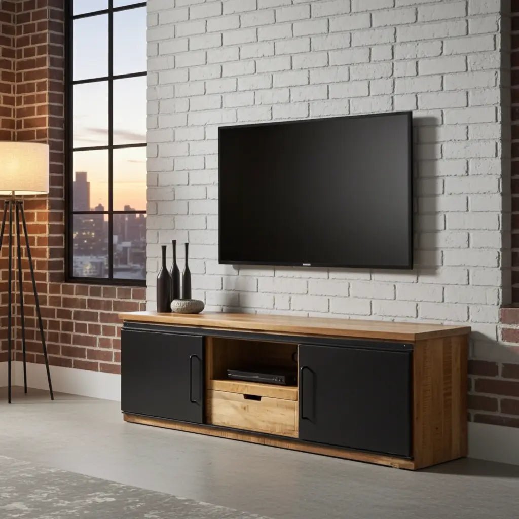 Meuble télé en bois de manguier avec 2 portes coulissantes en acier