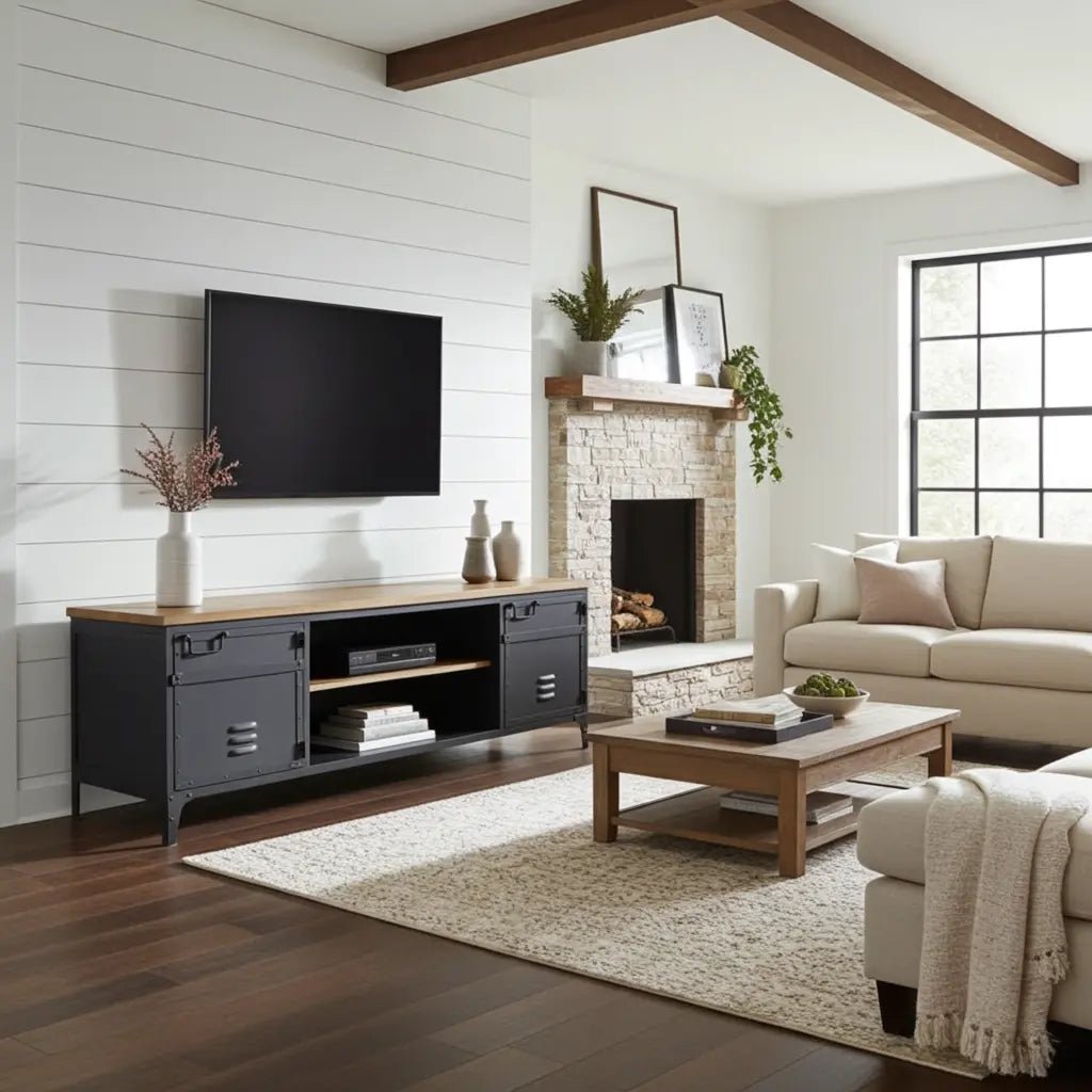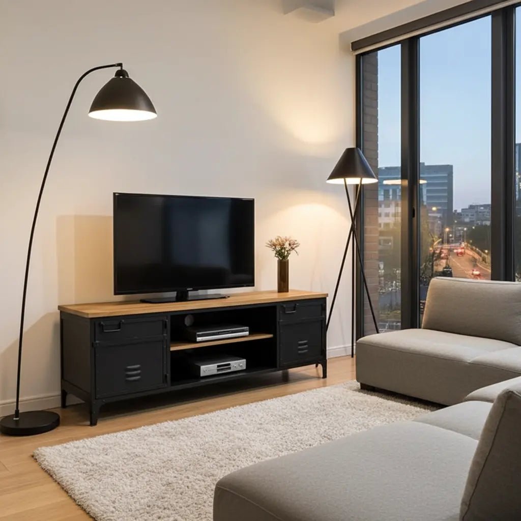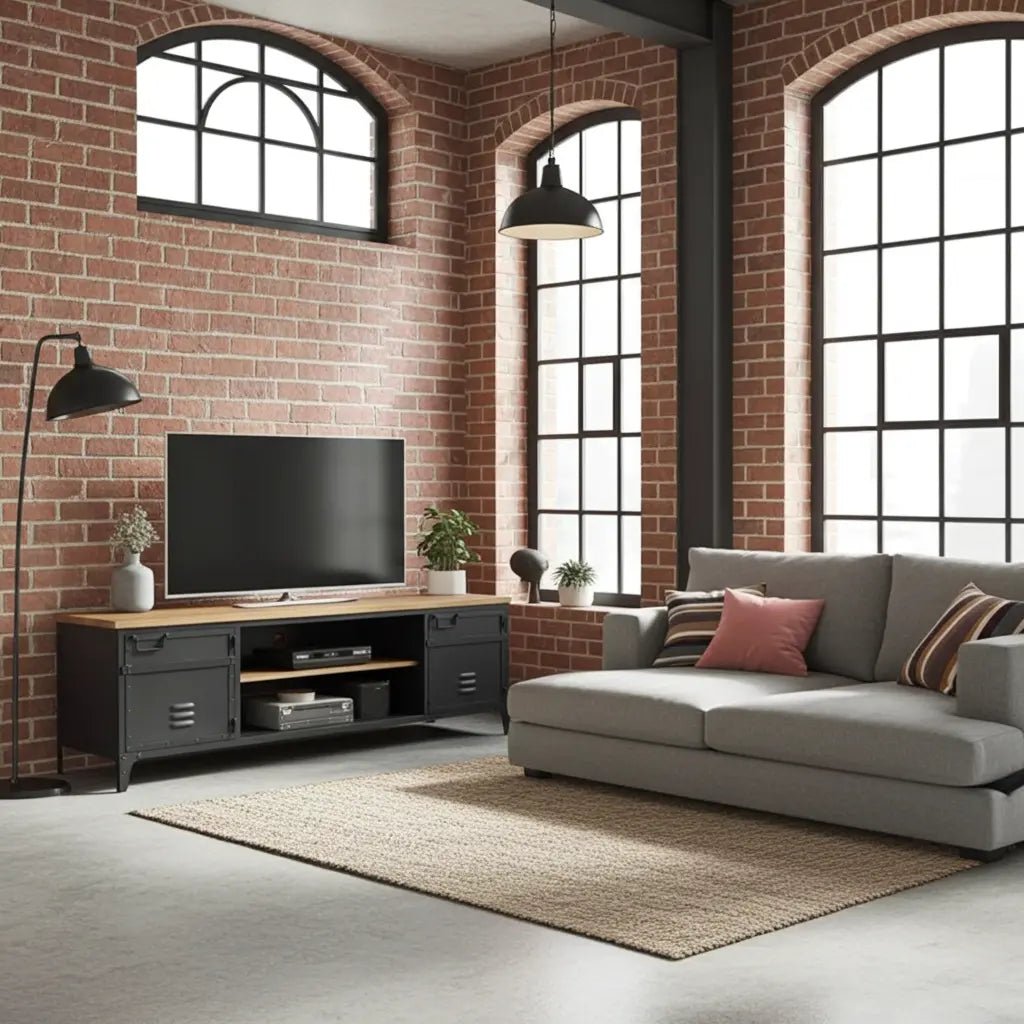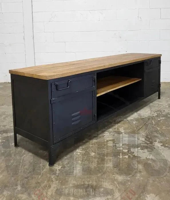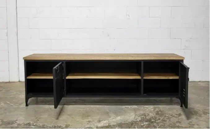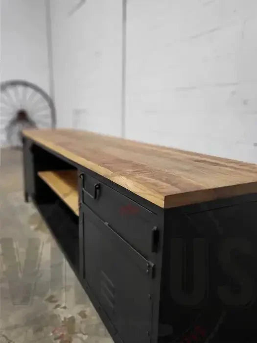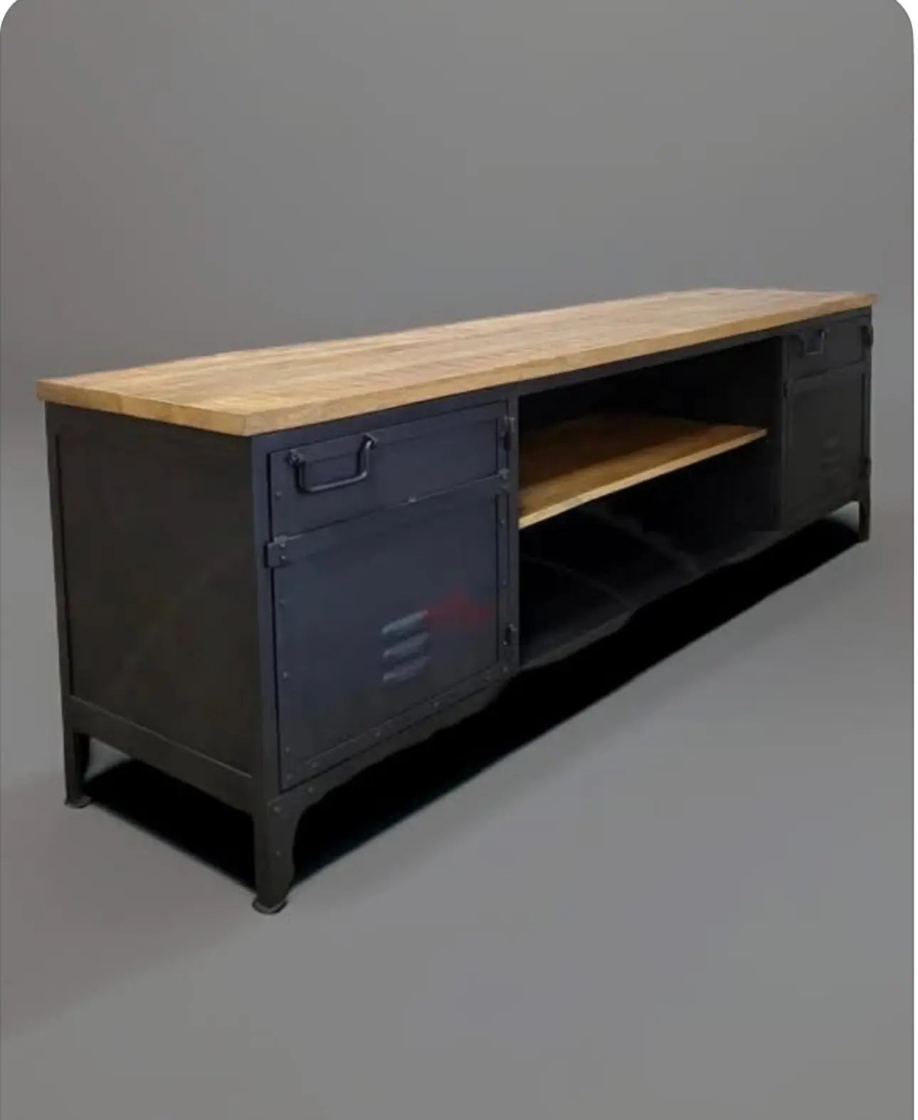 Meuble télé industriel en acier noir style casier dessus en bois de manguier